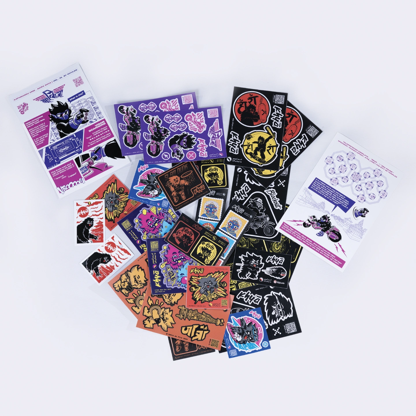 This easy to peal multipiece FMN x Khya sticker set offers a variety of detailed artwork of Hara Biker Khya, ideal for personalizing everyday items! Stick it on Notebook, Phone, Laptop, Water bottle, Instrument Box, storage drive, iPad, Helmet, Bikes, Skateboard, BMX