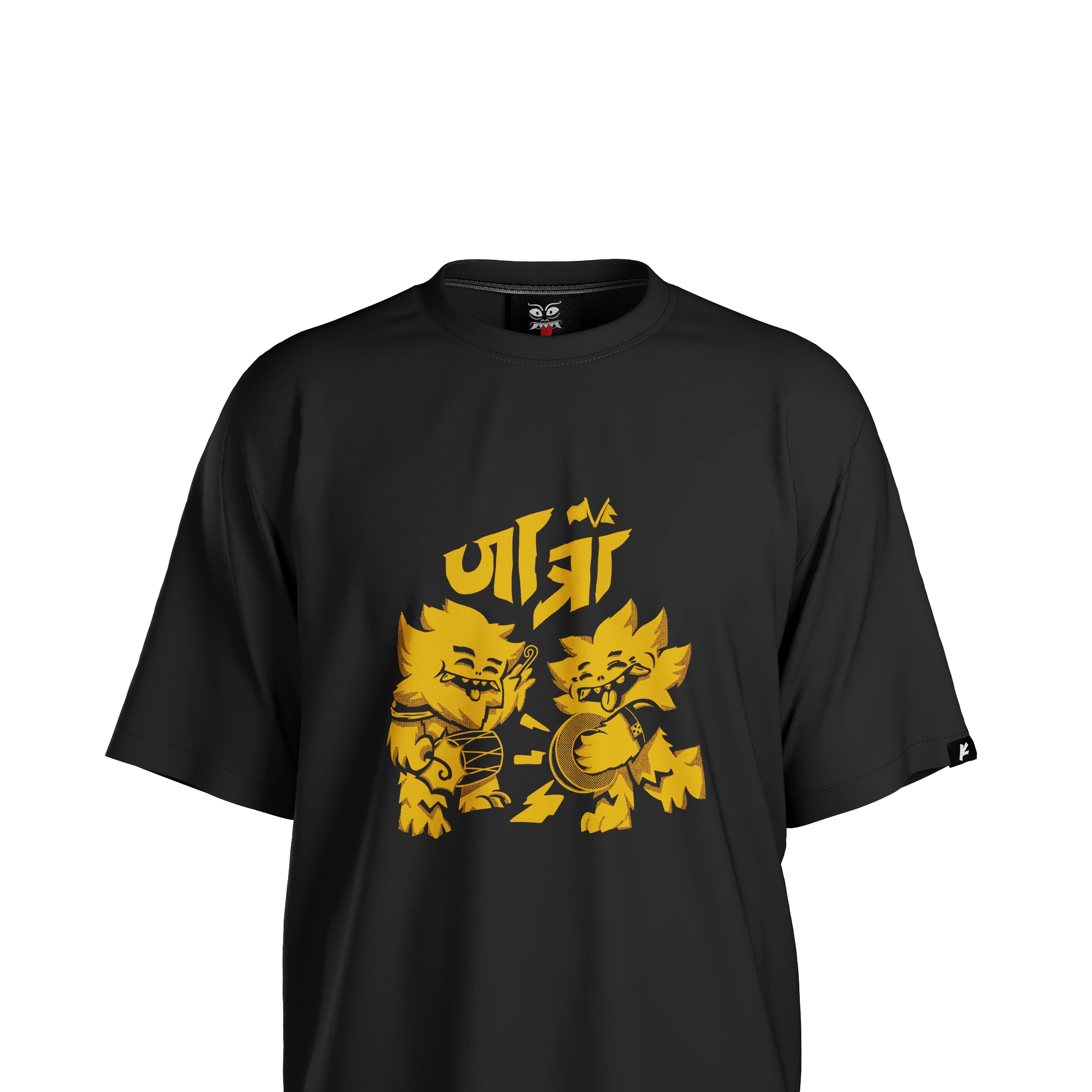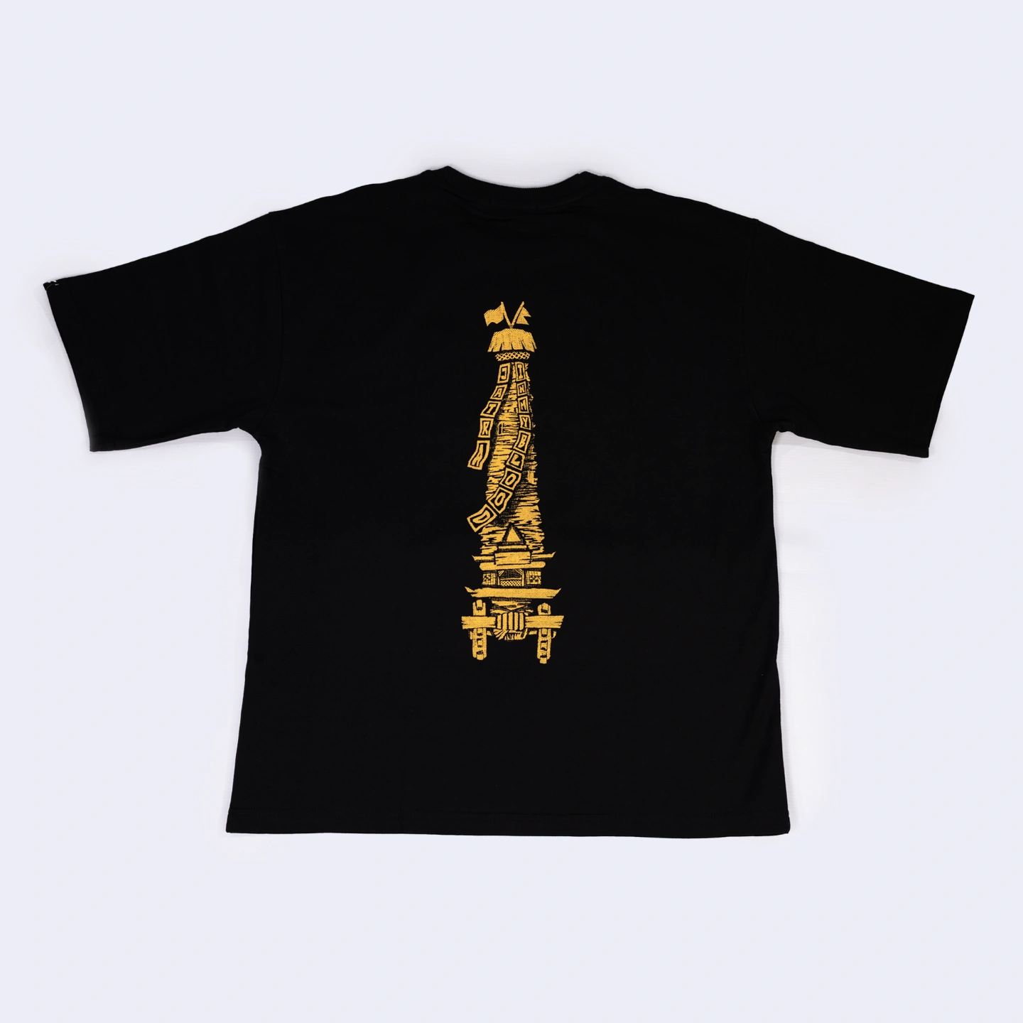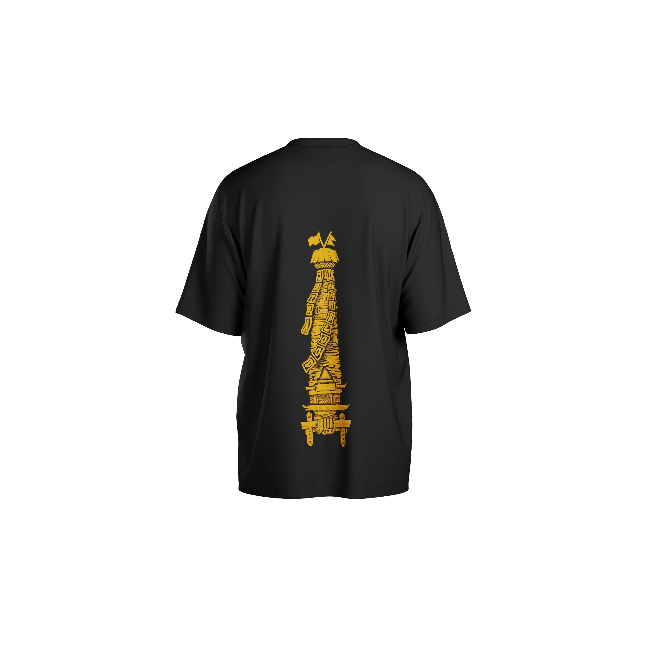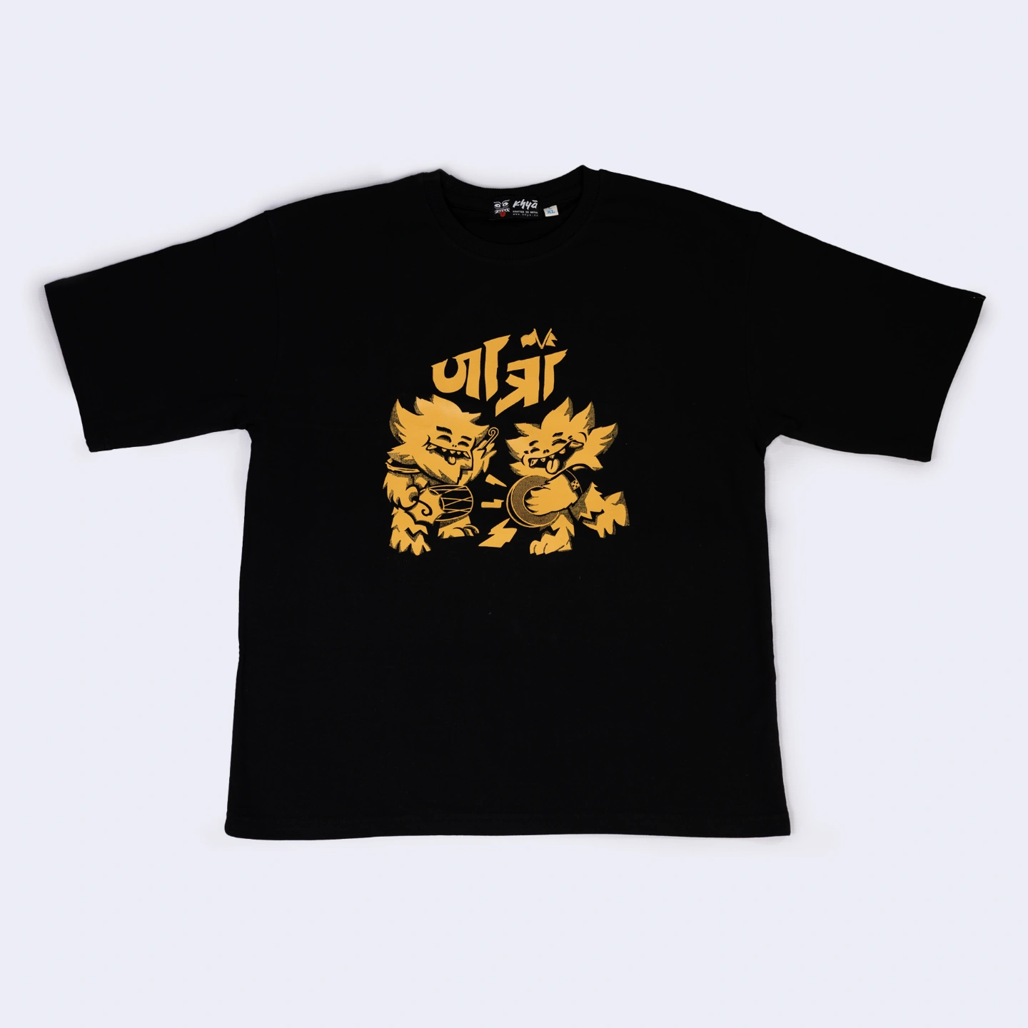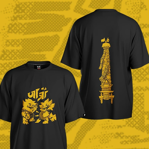 This tee is alive with culture. The back carries “Rato Machchindra” standing straight on the spine and it is actually the back of a chariot. On the front, Khya plays dhime and khi, the instruments of the jatra. When worn, the chariot seems to move forward with you. Look closer and you’ll find the encrypted words“Jatra in my Blood.” This is for the ones who truly carry it.