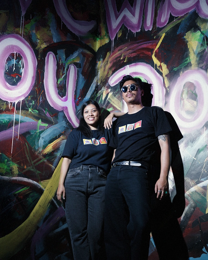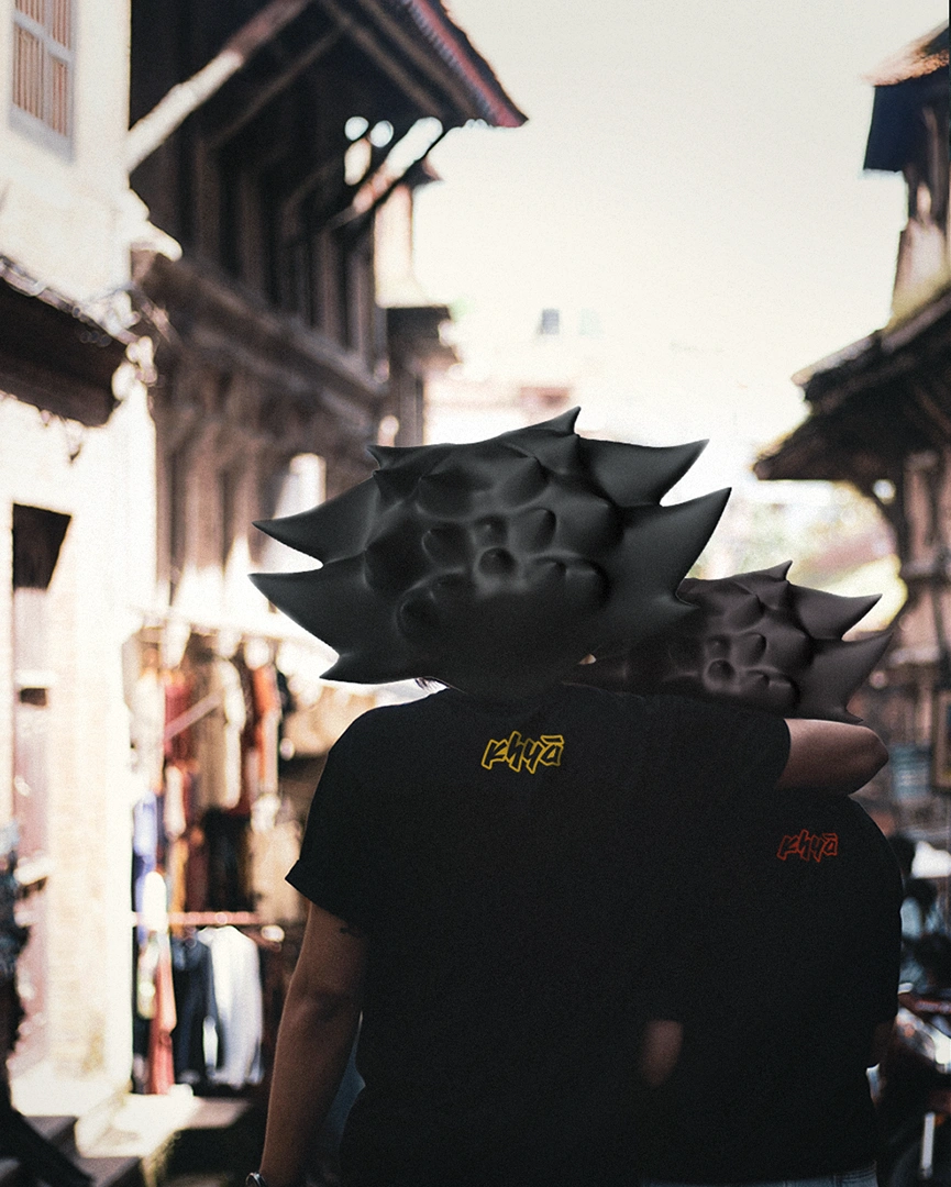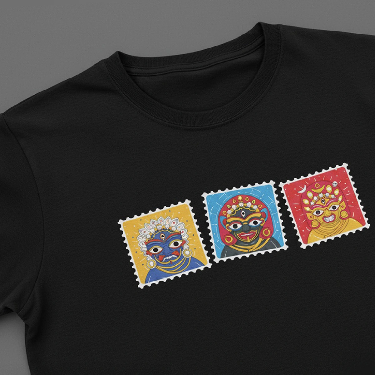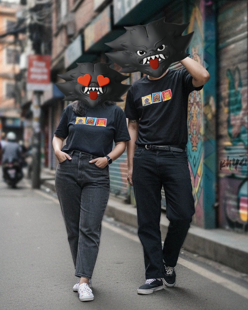 A multicolor collectible stamp styled artwork featuring three mighty Bhairavs : Aakash Bhairav, Kala Bhairav, and Swet Bhairav. Worn together, they represent the force of all three within us. First time ever, Khya brings in a new artist for this piece, marking the beginning of more collaborations to come. It is DTF printed on pure cotton and was launced on the most vibrant festival "Indra Jatra" or "Yenya Punhi"