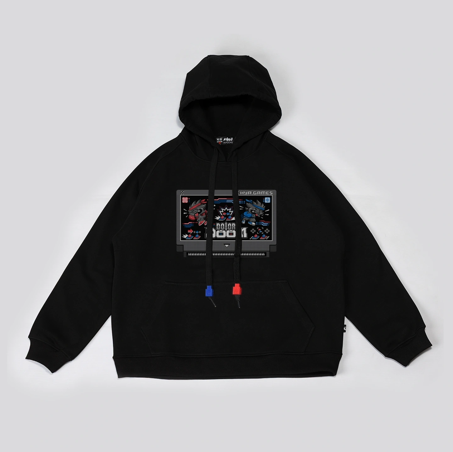 A Gamewear made for gamers, creators, and collectors. Nostalgic game cartridge inspired artwork in the front, where you pick and choose 3 game mode. On your back, unfolds the detailed Patan-X map played using the pawn tied in the hoodie lace. Try and decode the hidden message in the print. Wear it or play it, on the go!